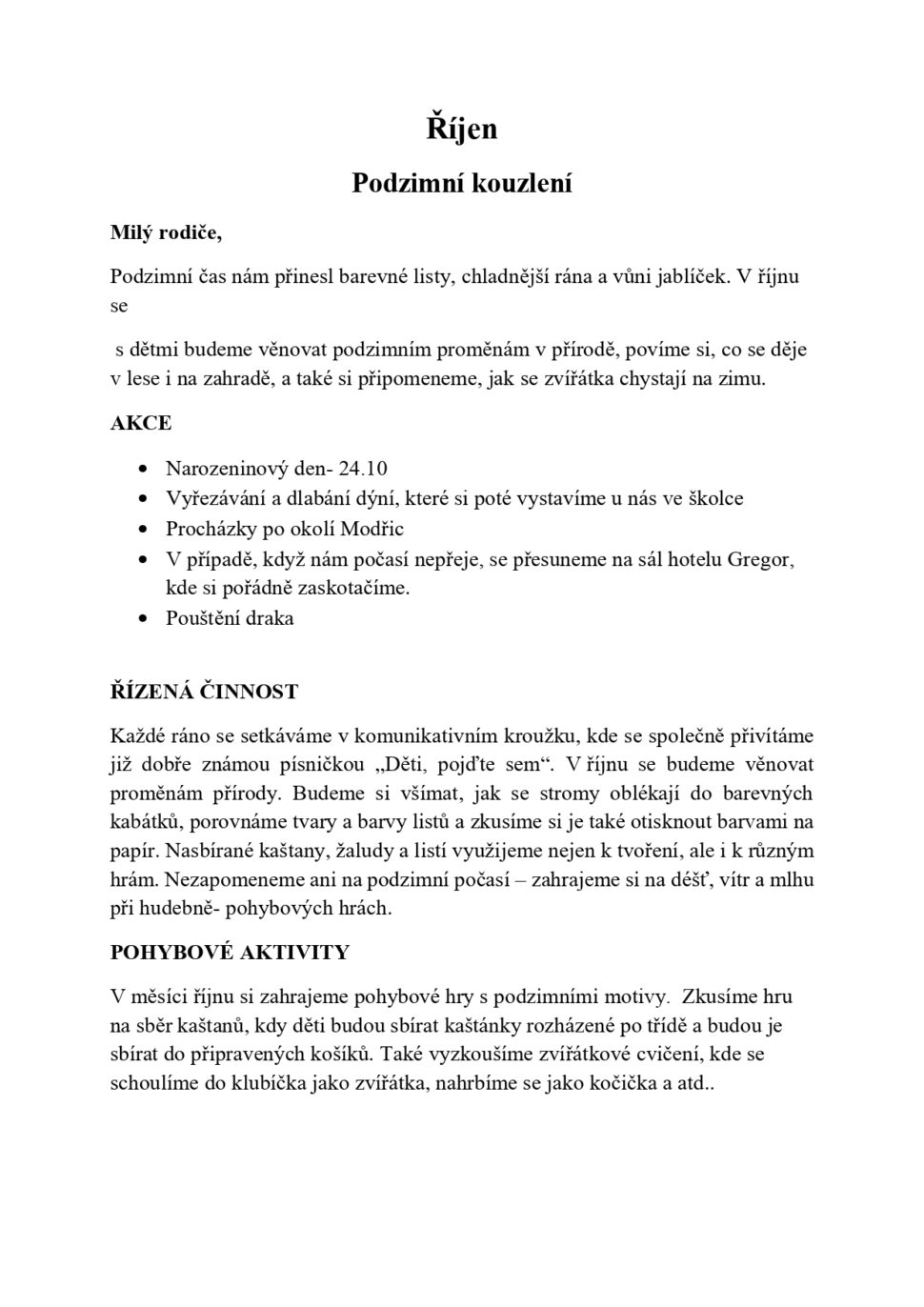 Naše další aktivity jsou ranní tématické povídánky, zpívání s kytarou, tvořivá dílnička, péče o zoubky, volná hra, sportovní olympiády, zimní radovánky, výlety do blízkého okolí, narozeninové oslavy, návštěva klauna, pravidelné krmení zvířátek v nedaleké farmě, měsíční návštěvy divadelního představení, návštěva místní knihovny spojená s promítáním pohádek, využíváme tělocvičnu a náš vlastní společenský sál v případě nepřízně počasí.