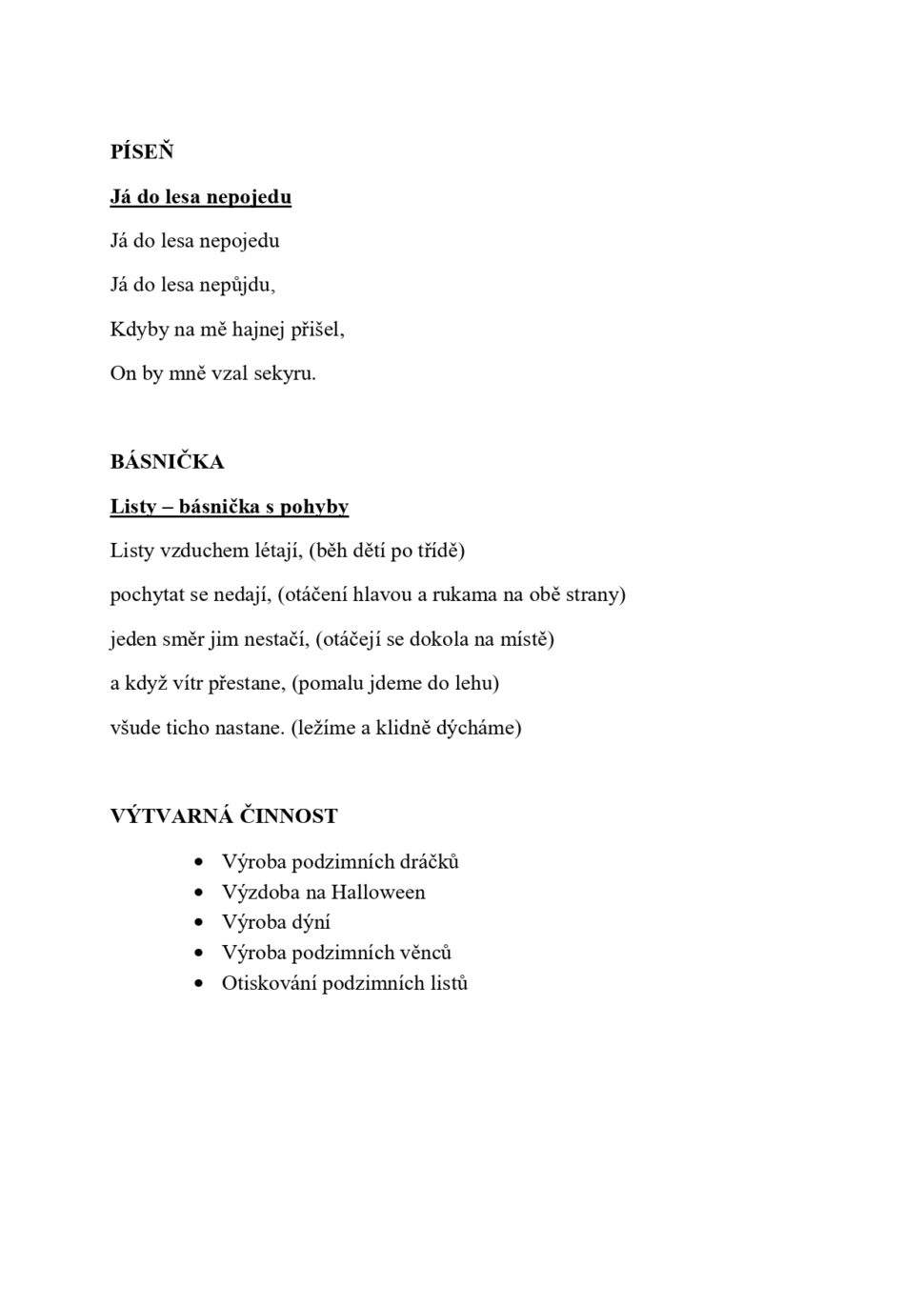 Obsah vzdělávacího programu je uspořádán do jednotlivých témat vycházejících z ročních období JARO, LÉTO, PODZIM, ZIMA.